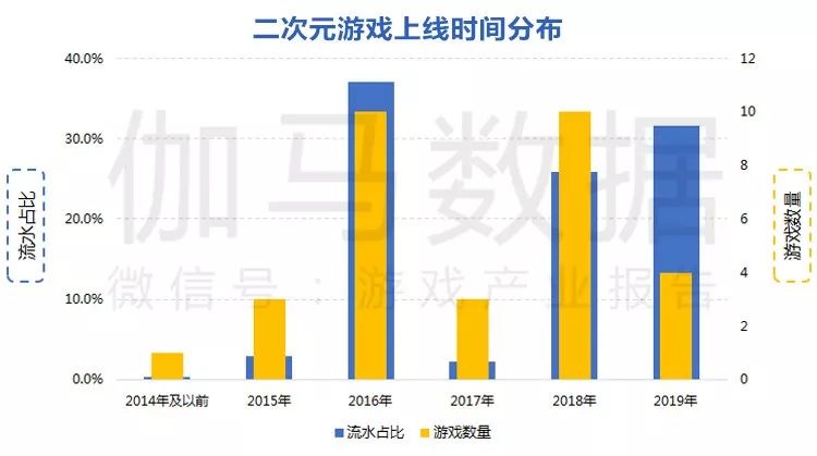 从上线时间来看,2018年与2019年新上线产品数量与收入占比快速提升,显示出二次元游戏依然处于高速发展期。