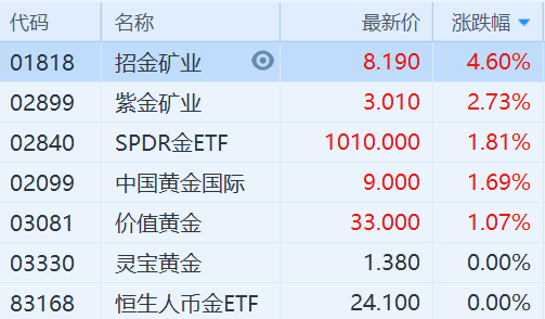 港股市场黄金股早盘普遍高开,招金矿业(1818.HK)高开4.6%,紫金矿业高开2.73%,中国黄金国际和价值黄金高开在1%以上。