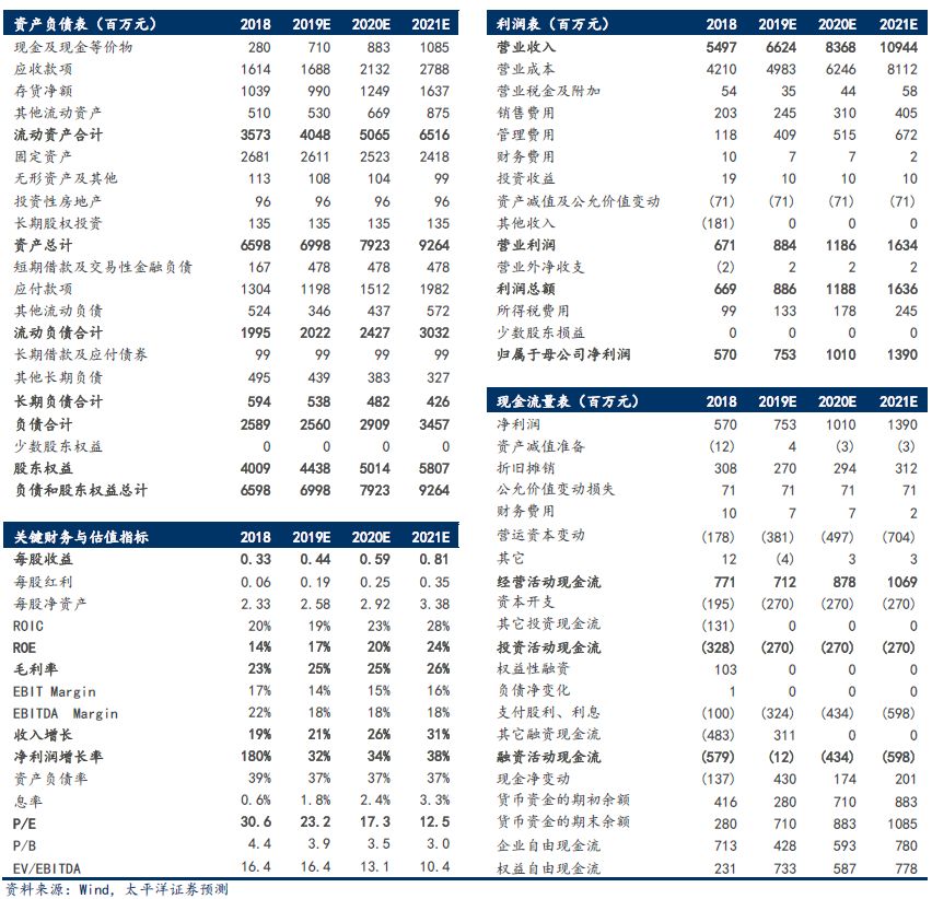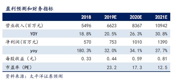 基于以上假设,我们预测公司2019-2021年的收入分别为66.24、83.68、109.44亿元;归母净利润分别为7.53、10.10、13.90亿元;EPS为0.44、0.59、0.81元。