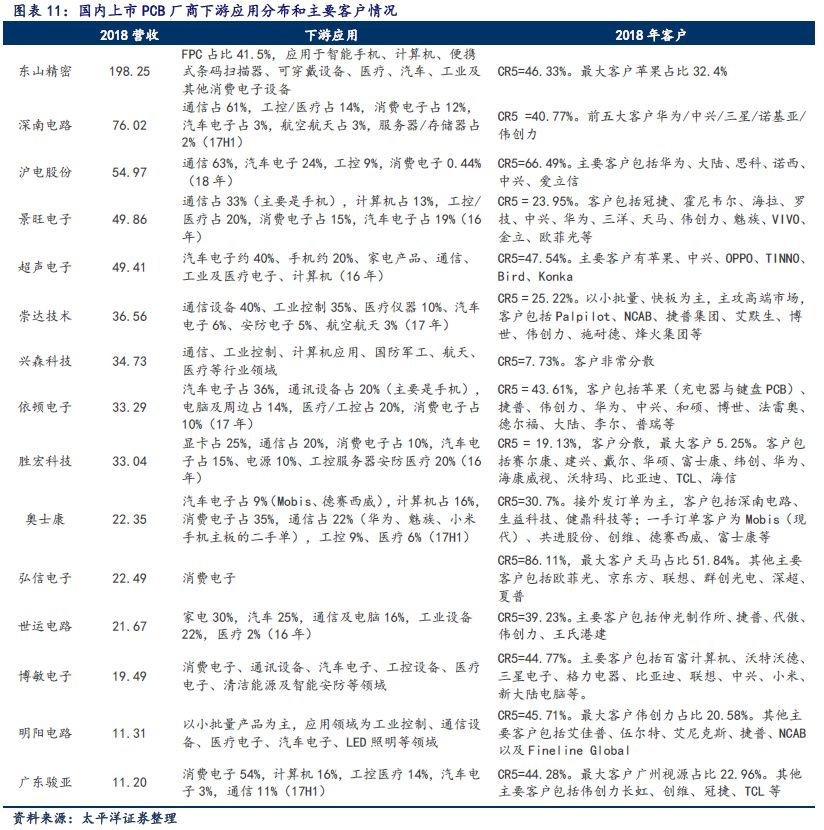 2、我们对比了国内上市PCB厂商的下游分布与客户结构,认为享受5G红利的PCB厂商屈指可数。我们认为尽管国内PCB厂商众多,但应用分布较为广泛,通信板块占比30%以上的企业仅有深南电路、沪电股份、景旺电子和崇达技术这四家。而景旺电子和崇达技术的客户集中度相对较低,2018年CR5分别为23.95%和25.22%,可以看出它们在行业下游大客户的供应级别依然较低。因此我们认为短期受益5G的通信PCB供应商主要是深南电路和沪电股份。