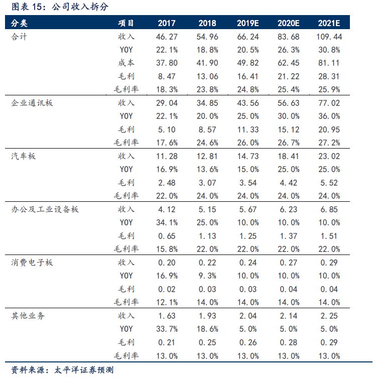 收入方面,假设企业通讯板未来三年增速分别为25%、30%和36%;汽车板收入增速为15%、25%和25%;办公及工业设备板与消费电子板收入增速分别为10%、10%、10%;其他业务收入增速分别为5%、5%和5%。