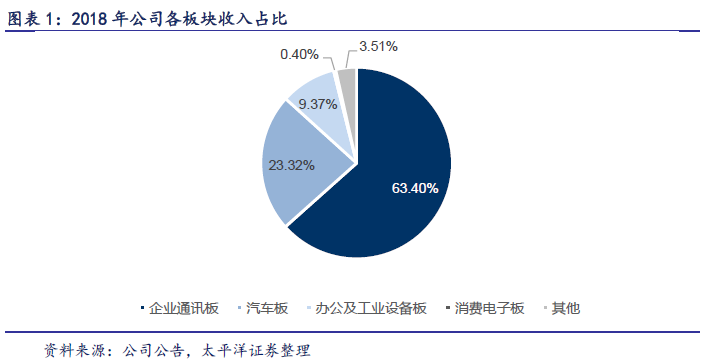 主营业务:沪电股份主要从事印刷电路板的生产和销售,产品包括单双面板及多层板、HDI、电路板组装产品等。产品广泛应用于通讯、汽车、办公及工业设备板、消费电子、航空航天板。公司的主要产品是企业通讯板和汽车板,2018年占收入比例分别为63.40%和23.32%。