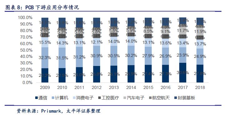 PCB按应用分为通信、计算机、消费电子、工控医疗、汽车电子、航空航天和封装基板这七大类。得益于3/4G通信网络的建设以及汽车电子的广泛应用,09到18年通信和汽车电子领域的PCB产值占比有22.2%和3.8%分别提升至27.8+%和11.9%,是PCB应用增长最快的领域。我们认为,通信和汽车领域的PCB结构性增长不会结束,未来5G跟车联网时代的来临对于PCB行业来说依然是强劲的驱动力。