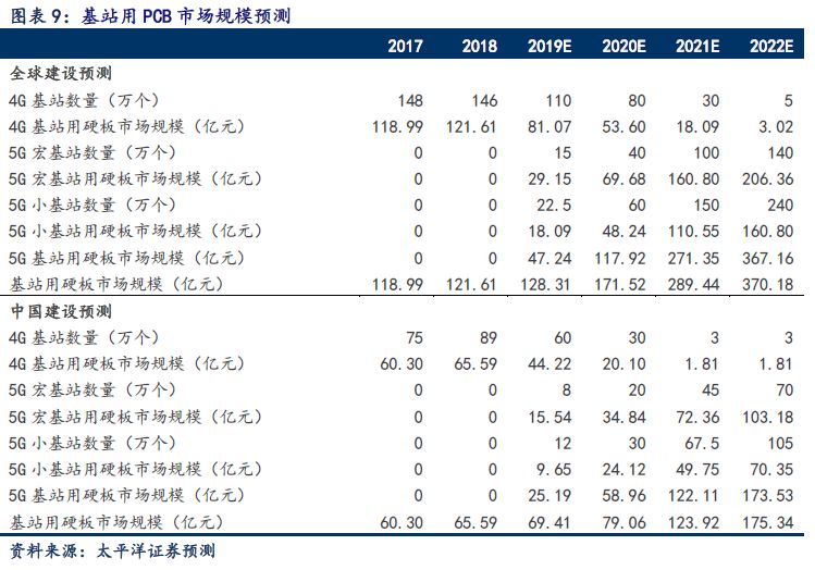 1、我们基于单基站PCB价值量对于未来三年5G用硬板的市场规模作出预测。我们预计2019-2021年全球5G基站用硬板市场规模为47/118/271亿元,4G+5G基站用硬板市场规模为128/172/289亿元。我们认为2019年5G带来的增量会覆盖4G需求的下滑,通讯基建PCB整体增长有限。而从2020年开始5G建设高峰将带动基站用通讯板进入高速增长期,需求有望在三年内翻倍。