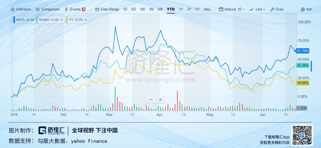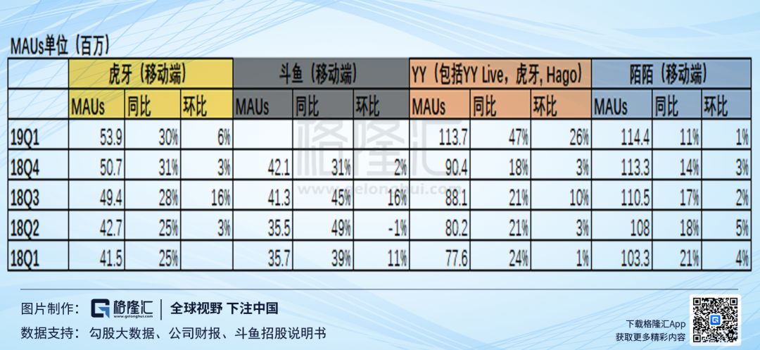 4月,斗鱼正式向美国证券交易委员会提交招股说明书,揭开了其神秘的面纱。5月,虎牙,陌陌和YY相继发布19年第一季度的成绩单。在互联网公司第一季度普遍受广告寒冬的影响下,虎牙,陌陌和YY的Q1财报数据都超过分析师预期。