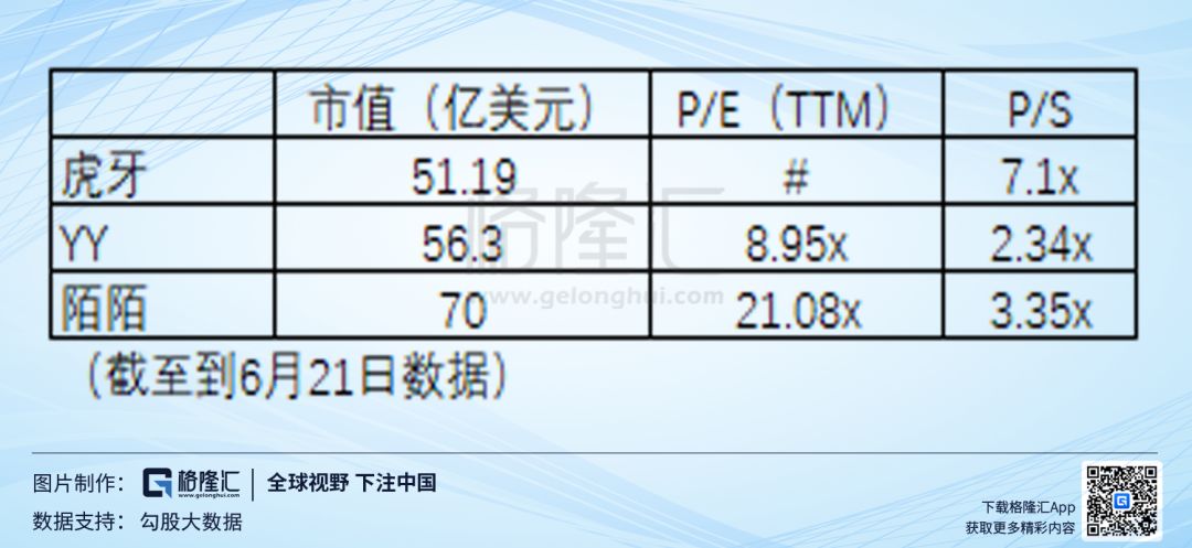从股价上看,从今年以来,虎牙累计涨幅61.76%,陌陌涨幅42.36%,YY涨幅18.66%。YY的涨幅最小。前段时间受大环境的影响,三个直播平台的股价最近跌了不少。陌陌更是因为附近动态功能关停,探探下架等事件股价大跌。但由于陌陌大部分收入来自于直播,市场预、预期事件对陌陌的营收影响不大,所以股价也迅速反弹,回到34美元左右。