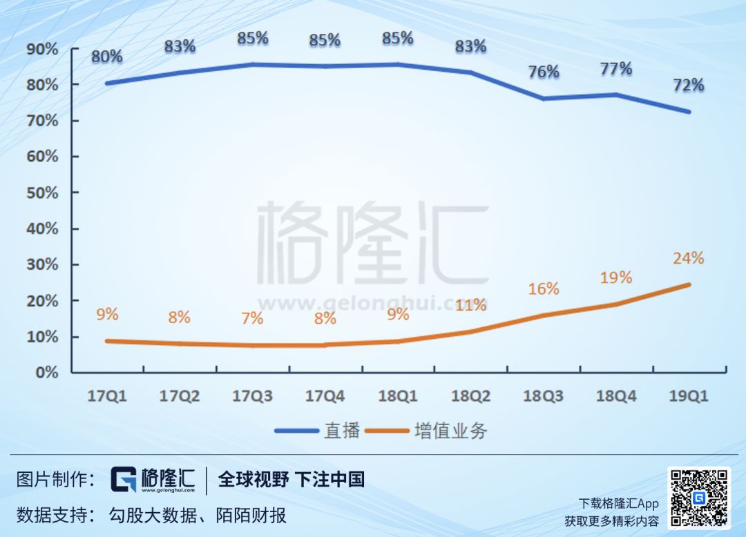 从18年开始,陌陌就开始有意降低直播收入占总收入的比例。根据19年Q1财报数据显示,直播收入占比下降至72%,增值业务的占比上升至24%。