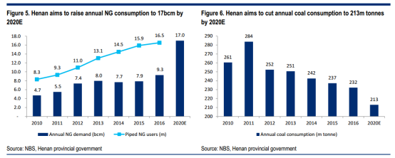 据悉,河南省内有7个城市属于“2+26”城市,并有2个城市位于汾渭平原,所以在解决空气污染问题上面临着巨大的环保压力。在这样的高压背景下,河南省政府计划将全省的天然气用气量从2016年的93亿立方米提高至2020年的170亿立方米,复合年增长率为16.3%。同时,全省的煤炭消耗将从2016年的2.32亿吨下降至2020年的2.13亿吨,复合年下降率保持在2%左右。