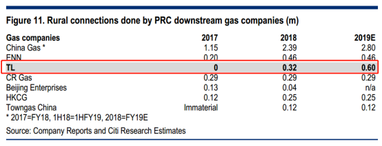 2018年,“煤改气”投资基金完成了32万户的用户接驳,并计划于2019年、2020年分别完成60万、100万的用户接驳数,届时业务体量将仅次于行业龙头中国燃气。在花旗看来,这样的目标是有很大可能实现的。一方面,在已有的燃气项目区域内,2019年至今天伦燃气已经累积有17万可接驳的乡镇用户;第二,在超出现有覆盖的区域,天伦燃气也已完成了4万户的新增接驳。
