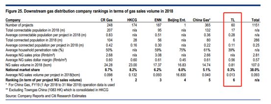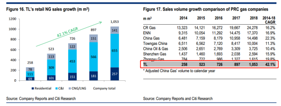花旗认为,2019年至2021年,天伦燃气6,800万-1.8亿立方米的销气量增加将来自新增乡镇用户接驳,同时销气毛差为0.4元/立方米。