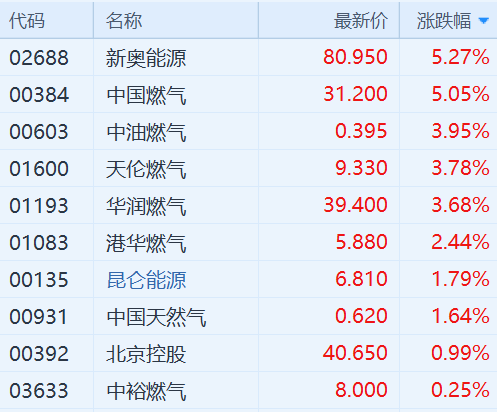 城镇燃气接驳费靴子落地新奥能源(2688.HK)领燃气股普涨