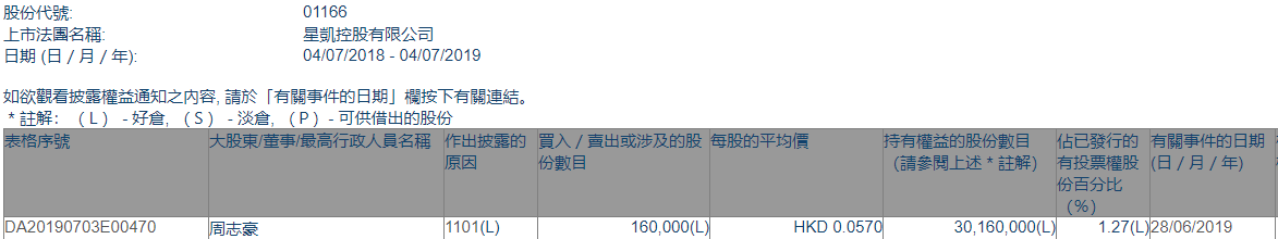 星凯控股(01166.HK)获执董周志豪增持16万股