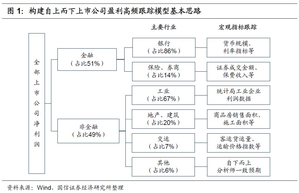 在报告《ROE基础策略框架系列:构建自上而下的盈利高频跟踪模型》中,我们构建了一个自上而下的上市公司盈利高频跟踪模型。我们的基本思路是从产业结构的角度出发,充分利用丰富多样的宏观经济和行业数据,构建一个能够月度跟踪上市公司整体盈利变动的高频模型,从而得到更加领先的盈利预测信息。举例来说,我们可以使用国家统计局的工业企业利润数据来跟踪工业类上市公司利润情况(工业上市公司利润占全部A股公司约33%),用M2和金融机构信贷收支表数据跟踪商业银行资产规模变化、用利率数据判断商业银行净息差变化(商业银行利润占全部A股公司约44%)、用商品房销售面积和施工面积来跟踪房地产和建筑业上市公司利润变化(两者占比约10%)等等。如此,我们估计全部A股上市公司利润总量的90%以上可以通过自上而下的宏观经济数据来跟踪。