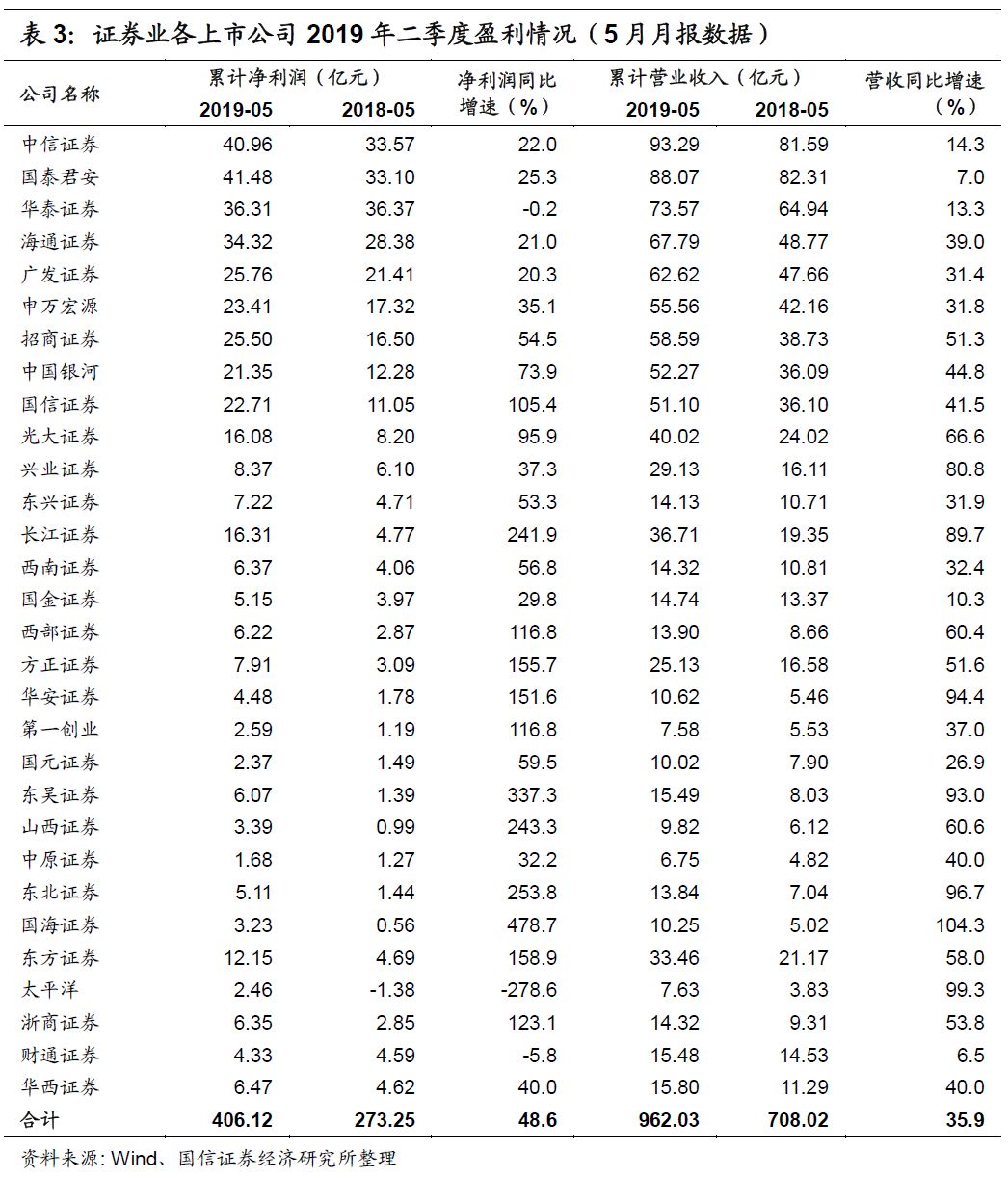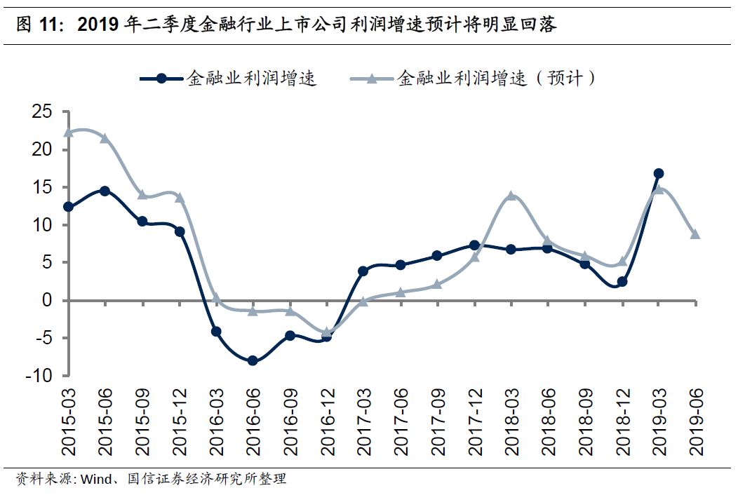 国信策略团队构建的上市公司盈利月度高频跟踪模型显示,我们预计2019年一季度A股上市公司整体业绩增速将继续回落。通过对截至2019年5月的各项宏观和行业数据的综合判断,我们预计2019年二季度全部A股上市公司净利润累计增速将降至5.8%,单季增速为1.2%,较一季度8.9%的利润增速明显回落。其中,金融行业整体增速预计将由一季度16.7%回落至8.7%,是造成A股利润增速回落的主要原因;非金融行业整体累计增速预计为2.9%,较一季度的0.7%小幅回升。