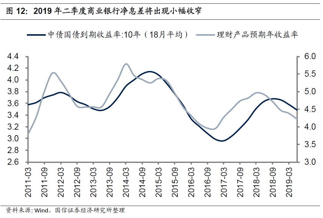 从2019年二季度行业运营情况来看,净息差的小幅收窄是导致商业银行净利润增速下行的主要原因。从银行资产端来看,2019年以来,过去18个月平均的10年期国债收益率出现了小幅下降,而从历史回溯来看,银行资产端利率与其走势较为一致,我们预计2019年二季度银行资产端收益率也将小幅下降。同时,2019年二季度商业银行负债端利率成本预计也将出现下降,从银行6个月理财利率来看,理财预期年收益率由一季度末的4.29%下降至4.20%。考虑到二季度包商银行事件带来的流动性及信用风险问题,综合来看,我们预计二季度银行的净息差将出现小幅收窄。