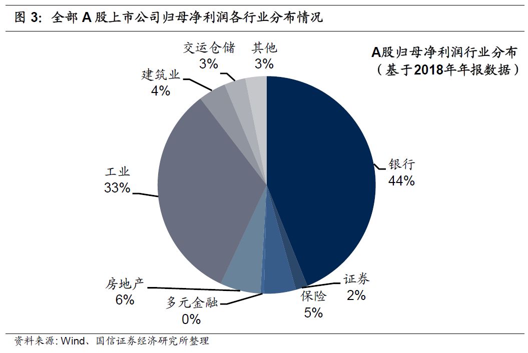 根据国民经济的行业分类标准,从A股归母净利润全行业分布来看,金融业与非金融行业比重相近,占比均为50%左右。从细分行业来看,银行占比高达44%,非银金融净利润占比为7%,而工业企业净利润占比为33%、房地产占比6%、建筑业占比4%以及交运仓储业占比3%。上述各行业占全部A股归母净利润增速高达97%。