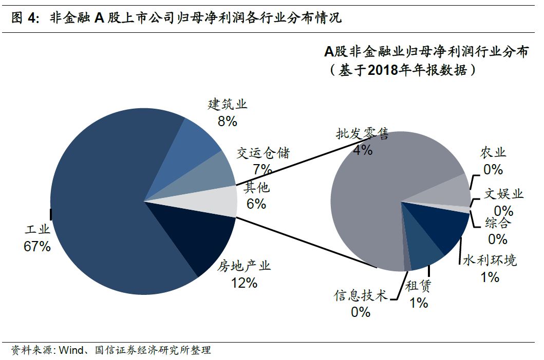 非金融行业中工业、房地产和建筑业以及交运仓储行业为主要行业,上述行业净利润占全部A股非金融行业的比重高达94%。从非金融行业的归母净利润分布情况可以看出,工业企业所占的比重过半,高达67%;其次是房地产业和建筑业,占比比重分别为12%及8%,交运仓储行业的比重也达到7%。