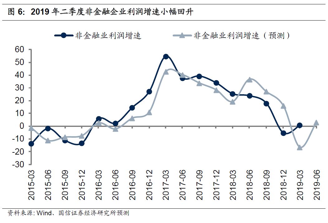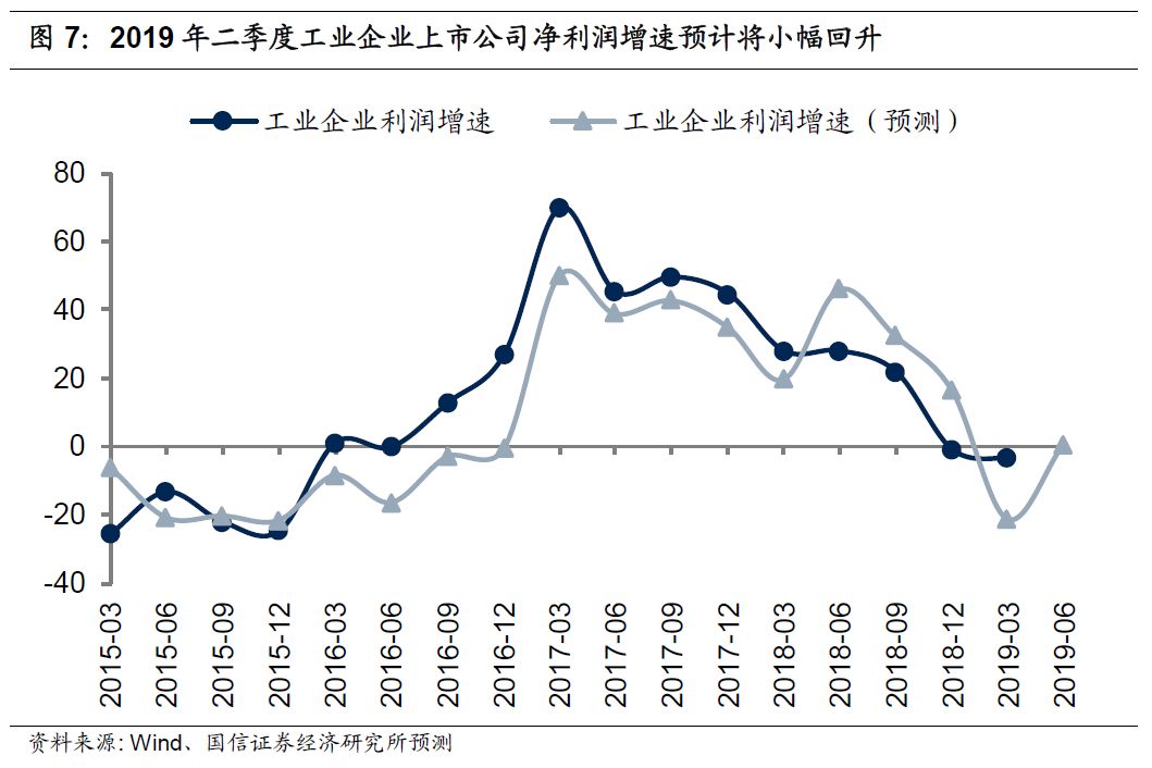 我们判断2019年二季度非金融企业整体净利润累计增速为2.9%,单季增速2.0%,较一季度0.7%的预计增速小幅回升。非金融企业净利润增速小幅回升的主要原因是工业企业盈利情况有边际改善。工业企业2019年二季度净利润累计增速预计上升至0.5%,单季增速1.3%,较一季度-3.4%的预计增速小幅回升。房地产建筑业2019年二季度增速预计小幅放缓至14.7%,单季增速12.7%;交运仓储业整体增速受航空及铁路运输业基本面低迷的影响预计将较一季度有所回落。