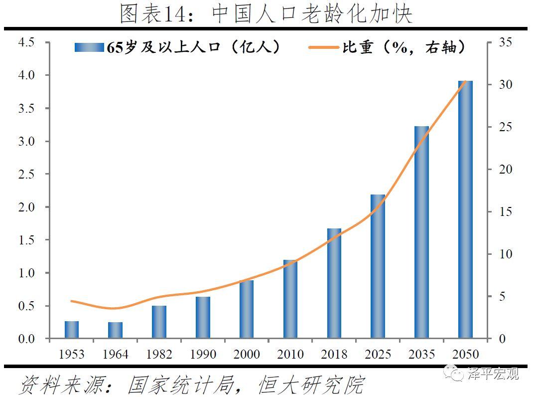 2)人口老龄化加快,养老负担日益加重,2018-2050年中国老人比重将从12%快速升至30%。老龄化是全球普遍现象,但中国由于计划生育老龄化速度前所未有。1970-2015年中国人口年龄中位数从19.3岁快速升至37.0岁,预计2050年将达50岁。从国际看,2015年美国、欧洲、日本、印度人口年龄中位数分别为37.6、41.6、46.3、26.7岁,到2050年将分别为42.0、46.6、53.2、37.5岁。从65岁老年人口占总人口超过7%的老龄化过渡到超14%的深度老龄化,法国用了126年、英国46年、德国40年、日本25年(1970-1994年);从深度老龄化到老年人口占比超过20%的超级老龄化,德国用了36年(1972-2008年),日本用了21年(1995-2006年)。中国2001年65岁及以上人口占比超过7%、进入老龄化社会,2018年占比达11.9%,预计中国将用约22年、即于2023年前后进入深度老龄化社会,再10年后即2033年前后进入超级老龄化社会,2050年达30.0%,老龄化速度前所未有。而且,由于人口基数大,老年人口规模也是前所未有。2018年中国65岁及以上人口已达近1.7亿,预计2050将达3.9亿,届时每3.3个中国人中就有1个65岁以上的老人。