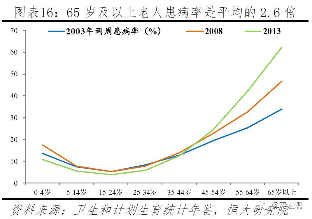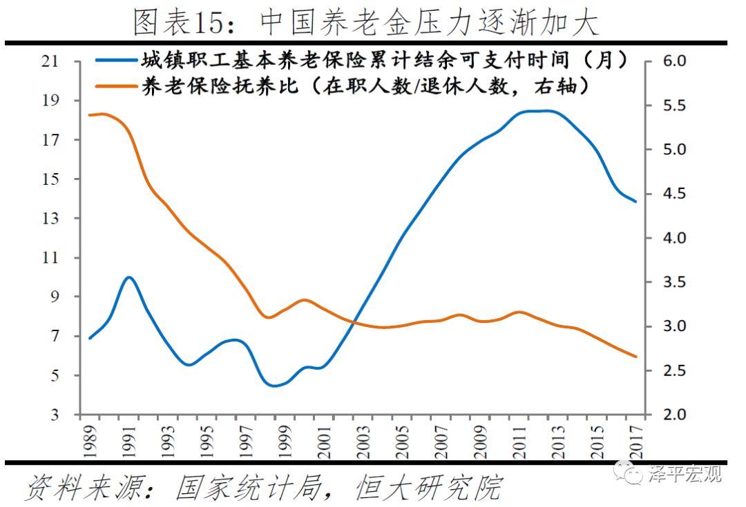 中国将逐渐成为世界上养老负担最重的国家之一,严重拖累国家财政、制约经济活力。从城镇职工基本养老保险基金看,中国累计结余可支付时间从2012年的18.5个月逐渐下降至2017年的13.8个月,养老金抚养比(在职人数/退休人数)降至2.65。2017年有6省养老金入不敷出,15个省的累计结余可支付时间在10个月以下,7个省的养老金抚养比已降至2以下。其中,黑龙江养老保险基金从2013年开始持续“入不敷出”,2016年累计结余转负。并且,随着老龄化加剧,医疗支出压力也将越来越大。根据国家卫生服务调查,2003-2013年中国调查地区居民两周患病率(患病人次数/调查人数)从14.3%增至24.1%;其中65岁及以上人口患病从33.8%增至62.2%,2013年老年人口的患病率是平均水平的2.58倍。