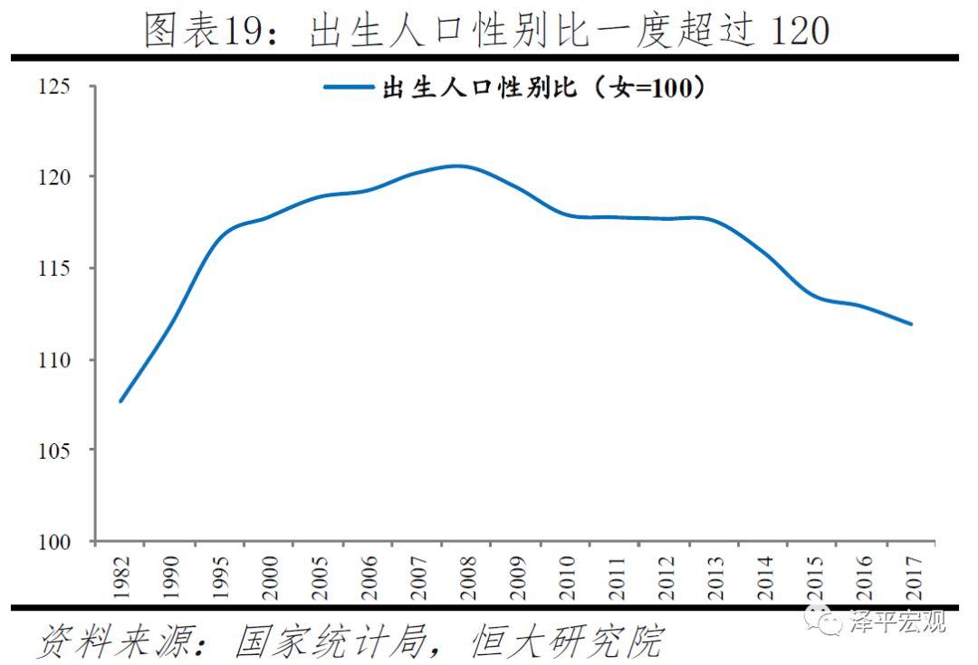 4)出生人口性别比从1980年代开始逐渐严重失衡,“剩男”问题日益突出。90后、00后男女性别失衡非常严重,出生人口性别比一度超过120。1982年中国出生人口性别比为107.6,1990年超过110,2000年接近118,之后长期超过120,2008年后开始持续下降,2017年已降至111.9。根据2010年人口普查资料,00后男女性别比达119,男性比女性多近1300万;90后男女性别比达110,男性比女性多近900万。80后、70后未婚人群男女性别比分别为137、308。2015年中国30岁及以上未婚男性规模已超2000万,预计到2040年将超4000万。1990年中国30岁及以上未婚男性仅略超1000万人,2000年超过1600万,2015年超过2000万。从城乡分布看,农村“剩男”问题比城市和建制镇更严重,2015年农村30岁以上男性未婚率为5.7%,超过城市的4.3%和建制镇的3.6%。从受教育程度看,未上过学的男性未婚率高达15%;其次是因为学习深造推迟进入婚姻市场的研究生学历男性,未婚率高达9%。随着1990年以来高性别比的出生人口逐渐进入婚嫁年龄,预计未来“剩男”问题还将更为突出,到2040年可能达约4000万。“个人困扰”的婚姻挤压问题可能演变为“公共问题”的人口安全问题,包括妇女买卖、性骚扰、性犯罪等。