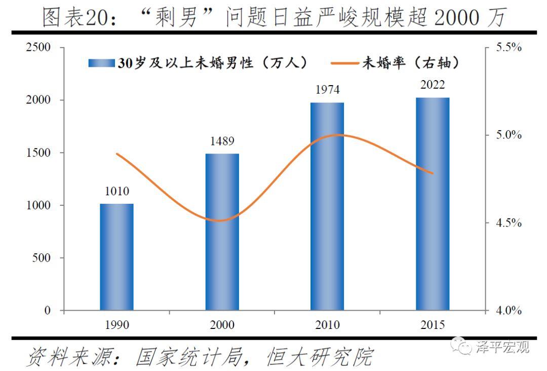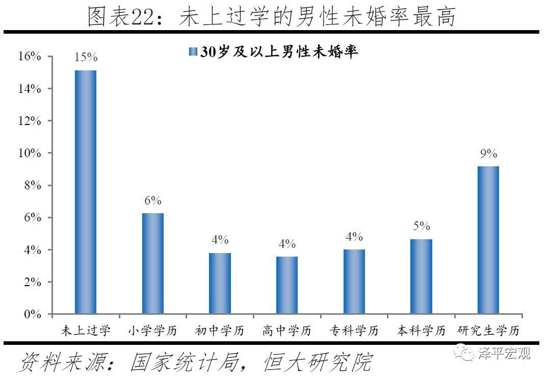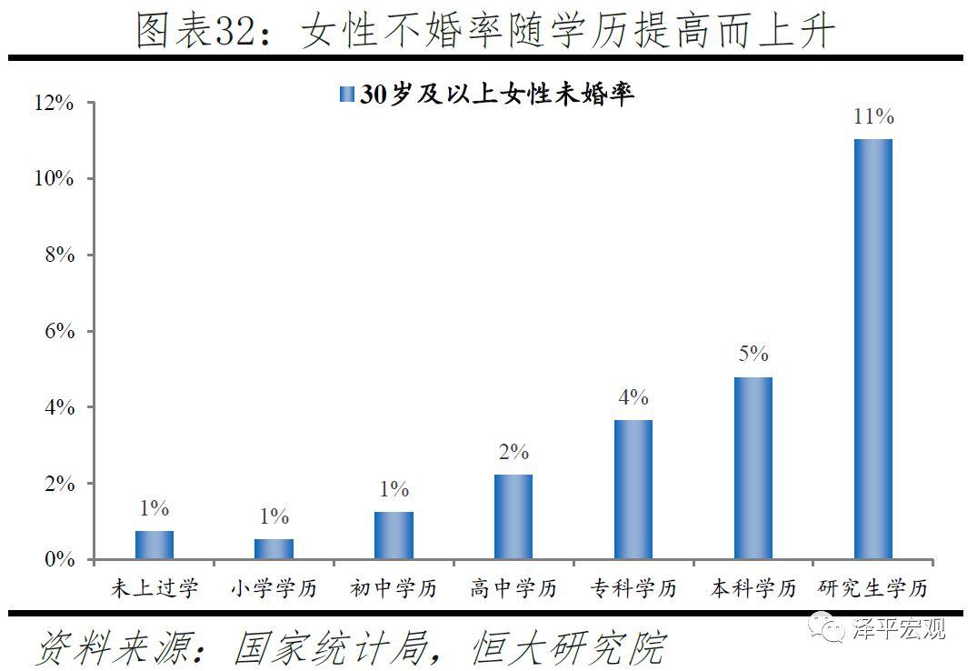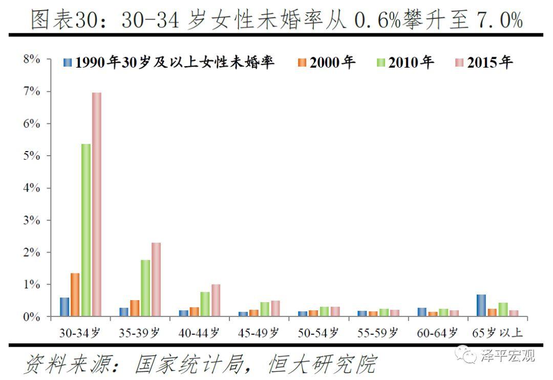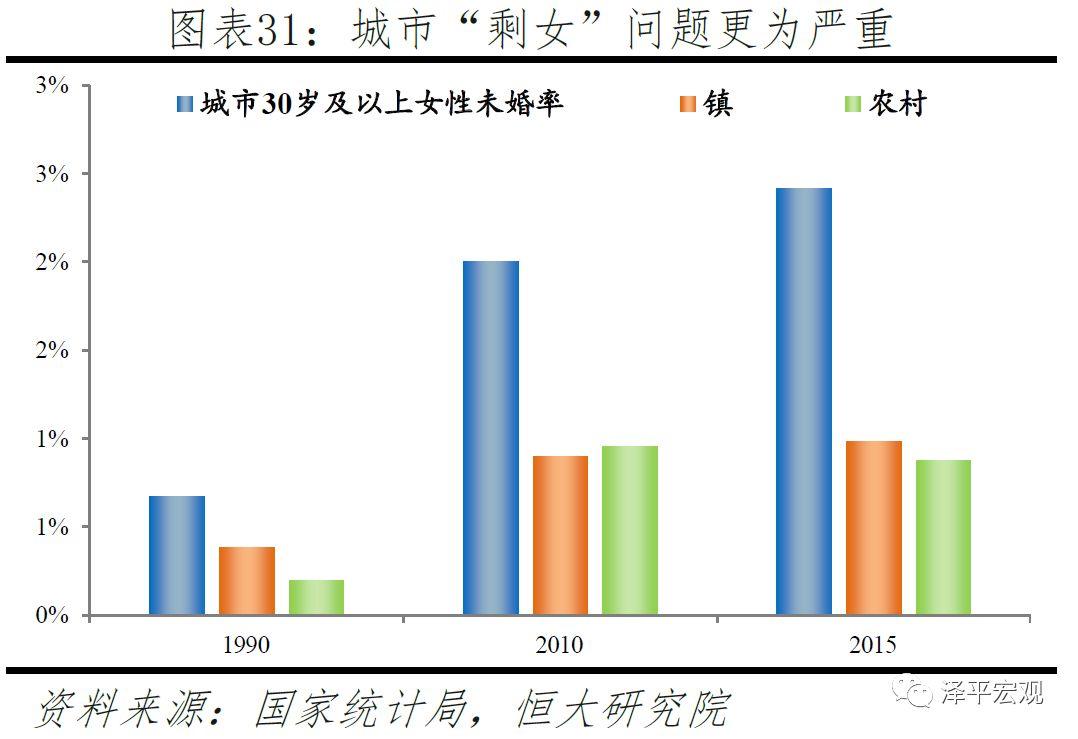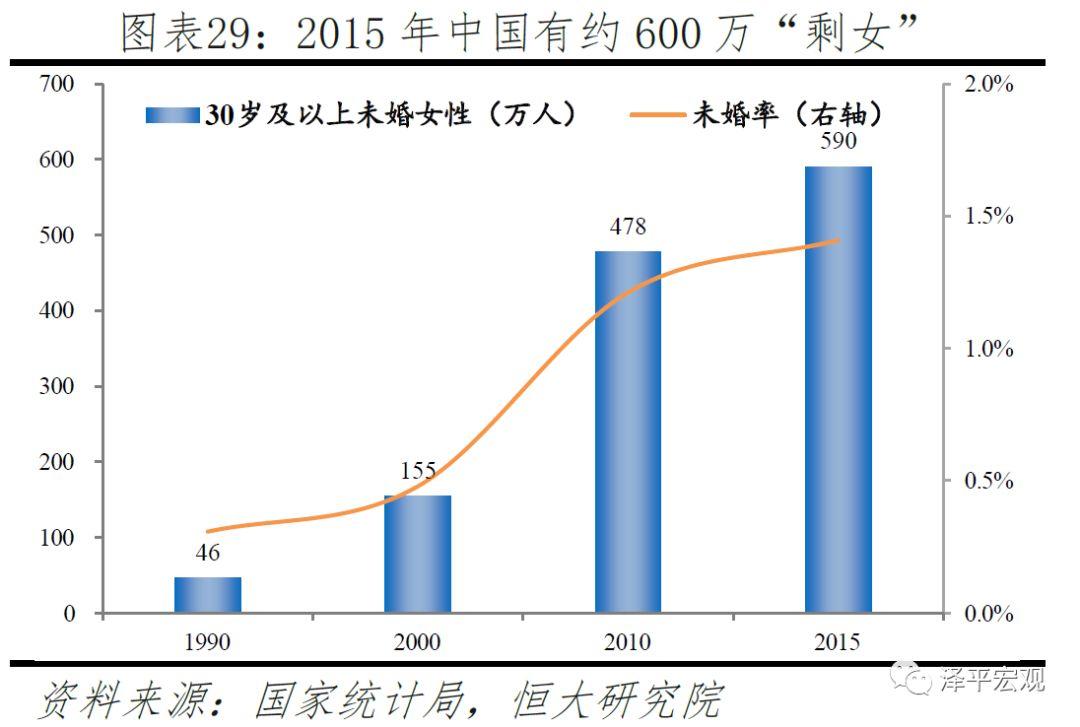 2)因婚姻市场匹配问题及单身主义等,“剩女”规模快速增加至约600万,学历越高“剩下”的概率越大。在婚姻市场中,女性多偏好不低于自身条件的男性,男性多偏好不高于自身条件的女性。这意味着即便婚姻市场男女性别比平衡,条件最好的女性和条件最差的男性也最有可能被剩下。1990年中国30岁及以上未婚女性仅为46万,2000年超过154万,2015年攀升至590万;其中,30-34岁女性未婚率从0.6%攀升至7.0%。从城乡分布看,2015年城市30岁及以上女性未婚率为2.4%,明显超过建制镇的1.0%、农村的0.9%。从受教育程度看,30岁及以上研究生学历女性未婚率高达11%,远高于本科学历及以下女性未婚率的5%。