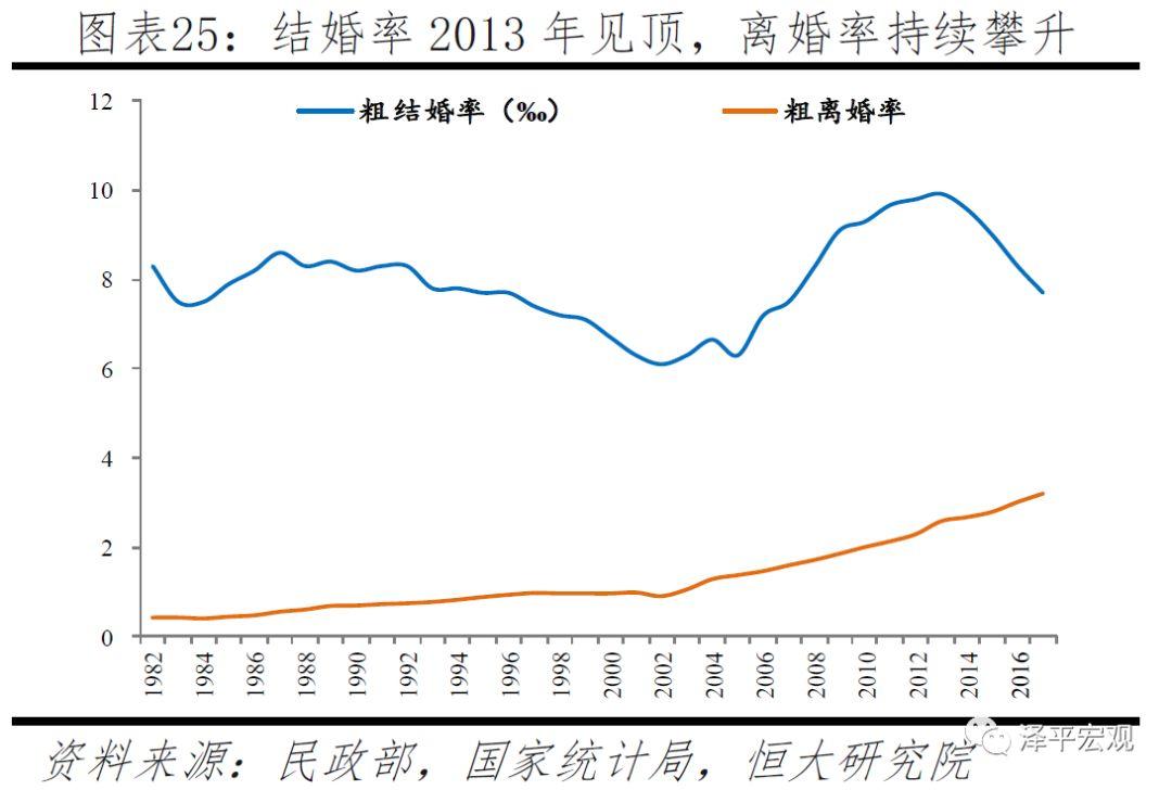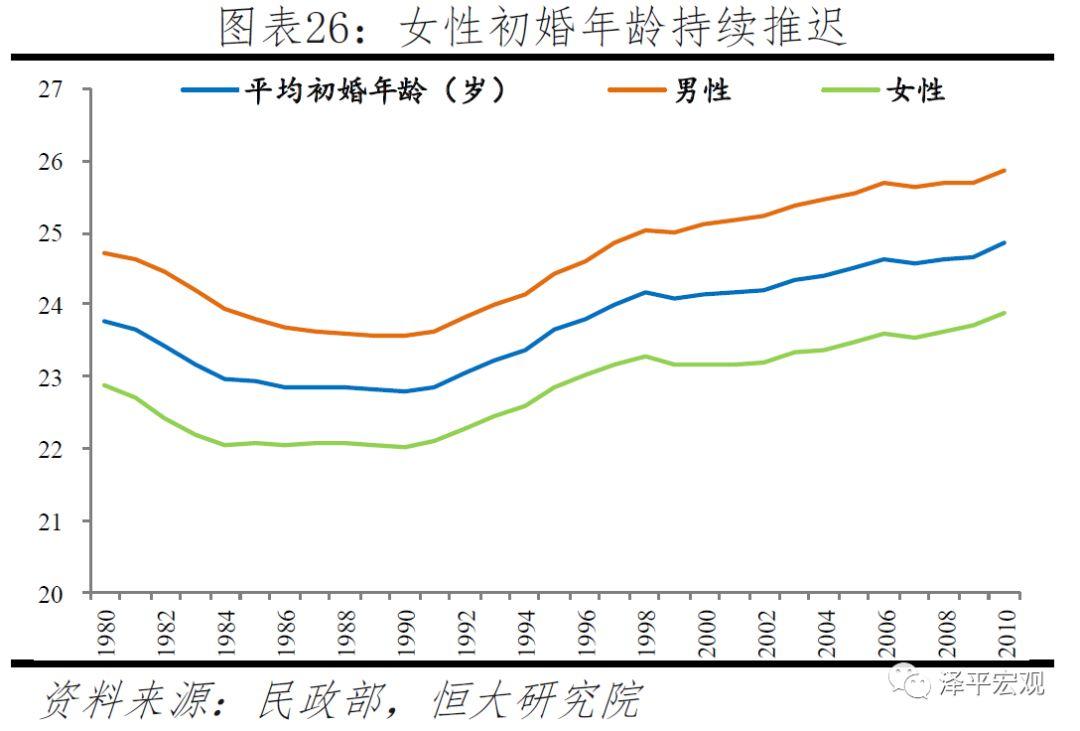 1)中国结婚率2013年见顶后持续回落,离婚率持续攀升;晚婚晚育现象日益突出,1990-2015年平均初育年龄从24.1岁推迟至26.3岁。与美国、欧洲非婚生子女占比高达40%-60%不同,中国非婚生子女占比大约不到10%,因此,中国的生育问题首先是结婚问题。2013年中国结婚登记对数达1347万对,之后持续下滑至2017年的1063万对,粗结婚率从9.9‰降至7.7‰。离婚登记对数从1995年之前的不到100万对攀升至2017年的437万对,粗离婚率攀升至3.2‰。1990-2010年男性平均初婚年龄从23.6岁推迟至25.9岁,女性平均初婚年龄从22.0岁推迟到23.9岁;其中,女性、男性平均初婚年龄分别在1996、1998年超过晚婚年龄(女23、男25岁)。根据民政部统计,2005-2016年20-24岁结婚登记人数(含再婚)占比从47.0%降至24.2%,25-29岁、30-34岁、35岁以上结婚登记人数占比分别从34.3%、9.9%、8.8%增至38.2%、12.8%、24.8%。