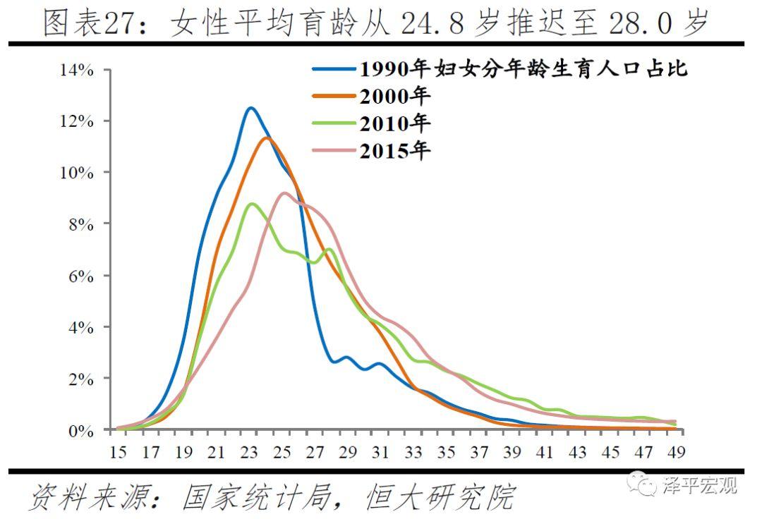 2)晚婚晚育、单身丁克、不孕不育等削弱生育基础。中国结婚率2013年见顶回落,离婚率持续攀升;晚婚晚育现象日益突出,1990-2015年平均初育年龄从24.1岁推迟至26.3岁,主要初育年龄从20-27岁推迟到22-29岁。因婚姻市场匹配问题及单身主义等,“剩女”规模快速增加至约600万,学历越高“剩下”的概率越大。此外,丁克家庭、不孕不育人群增多削弱生育基础。
