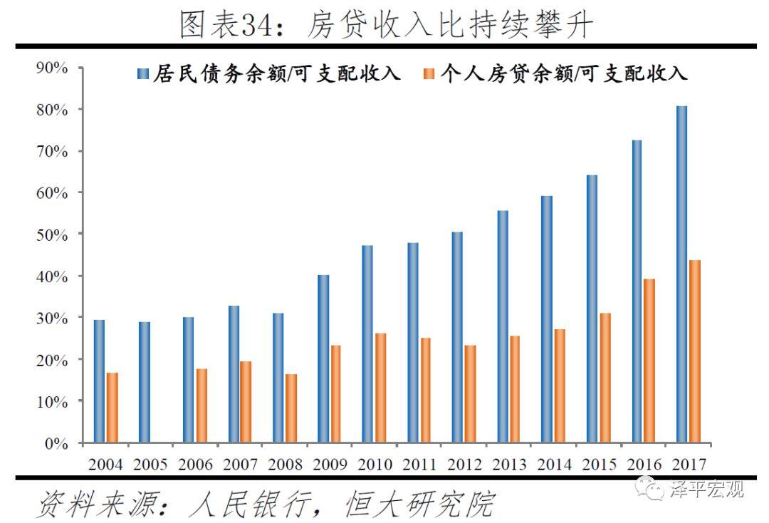 1)房价快速攀升,居民债务压力快速上升,2004-2017年房贷收入比从17%增至44%。1998年房改以来,房价总体保持大幅上涨,给家庭抚养孩子和为子女结婚购房带来了很大压力,1998-2018年全国新建商品住宅均价从1854元/平上涨至8542元。2004-2017年中国个人购房贷款余额从1.6万亿元增至21.9万亿元,增长13.7倍,占居民贷款余额的比例大致在50%以上,2017年为54%。房贷收入比(个人购房贷款余额/可支配收入)从17%增至44%,带动住户部门债务收入比(居民债务余额/可支配收入)从29%增至80%。现实中还有不少居民通过消费贷、信用贷等形式凑集购房资金,实际的房贷收入比可能更高。
