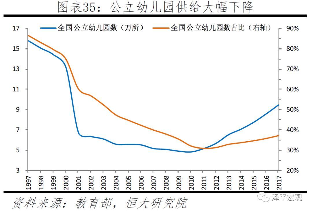 2)教育成本明显攀升,特别是公立幼儿园供给严重不足,1997-2017年中国公立幼儿园在读人数比例从95%降至44%。当前教育成本主要包括幼儿园学杂费、幼儿园及小学初高中阶段辅导班费用、大学学费及生活费等。根据新浪教育《2017中国家庭教育消费白皮书》抽样统计,学前教育阶段教育支出占家庭年收入的26%,义务教育和高中教育阶段占21%,大学阶段占29%。公立幼儿园供给大幅下降,许多家庭被迫选择价格昂贵的私立幼儿园,是学前教育费用高昂的一个重要原因。1997年公立幼儿园数占比86.5%,在园人数占比94.6%。从2001年开始幼儿园被大量推向社会办学,加上基层中小学大量撤点并校,尤其在农村,导致农村、县镇、城市幼儿园分别大幅减少4、1.5、0.9万所。2001-2017年全国幼儿园所数从11.2万增至25.5万所,公立幼儿园数从6.7万所减少至2010年的4.8万所,再回升至2017年为9.5万所,占比从60.1%降至30.7%再回升至37.1%;但公立幼儿园在园人数占比未有回升,从83.1%持续降至44.1%。城市、县镇、农村的公立幼儿园在园人数占比分别从75.5%、74.8%、90.6%下降至2016年的35.7%、33.4%、57.7%。此外,当前双职工父母面临中小学子女的接送难题。不少地方甚至还要求由父母批改学生家庭作业、并讲解错题,逐渐演变为“家庭作业演变成为家长作业”、“教师减负、家长增负”