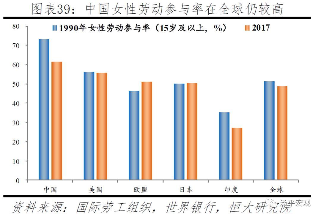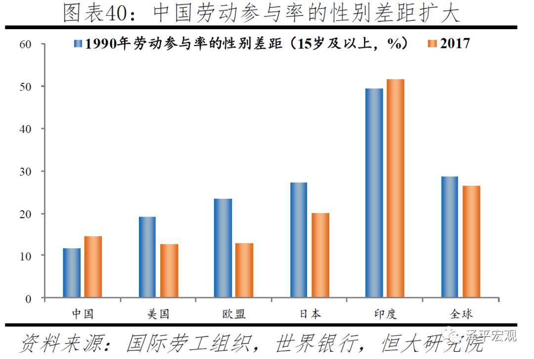 5)女性劳动参与率高但就业权益保障不够,导致生育的机会成本高。根据国际劳工组织统计,1990-2017年中国女性劳动参与率(15岁及以上)从73.2%降至61.5%,大幅下降11.7个百分点,但在全球仍然处于较高水平。2017年全球女性劳动参与率为48.7%,美国、欧盟、日本、印度分别为55.7%、51.1%、50.5%、27.2%。与此同时,尽管中国保护女性就业权益的相关法律法规不少,但职场的性别歧视仍然较为严重,1990-2017年中国女性劳动参与率与男性的差距从11.6个百分点扩大到14.6个百分点,而全球、美国、欧盟、日本男女性的劳动参与率差距均呈缩小态势。