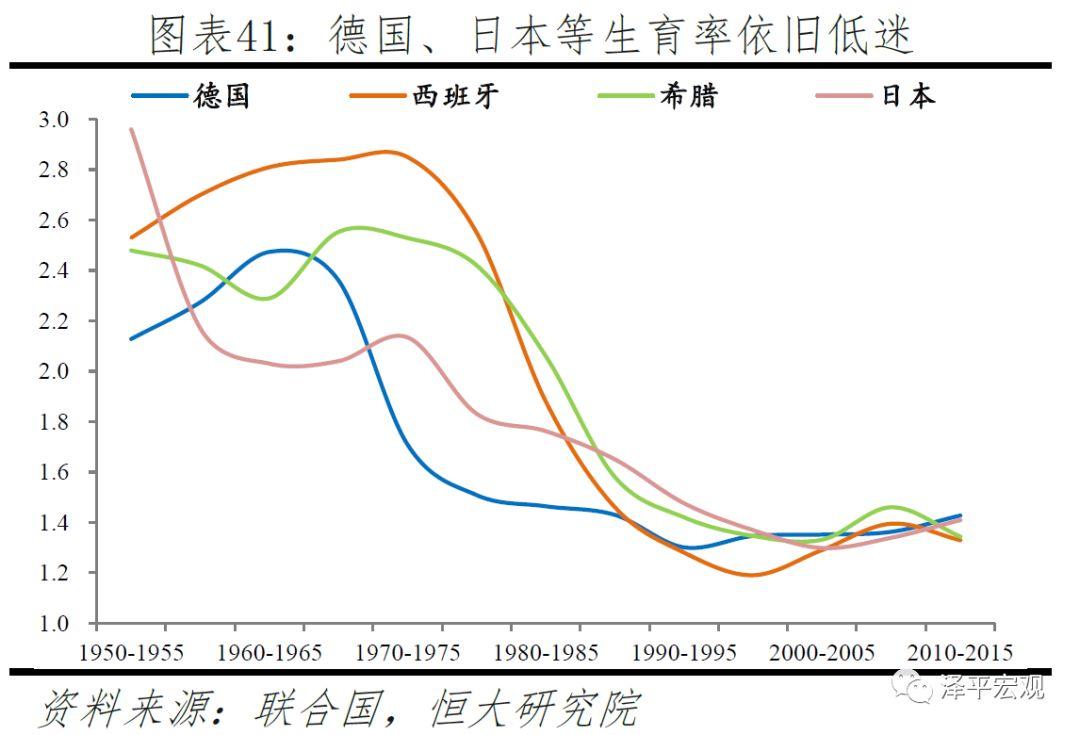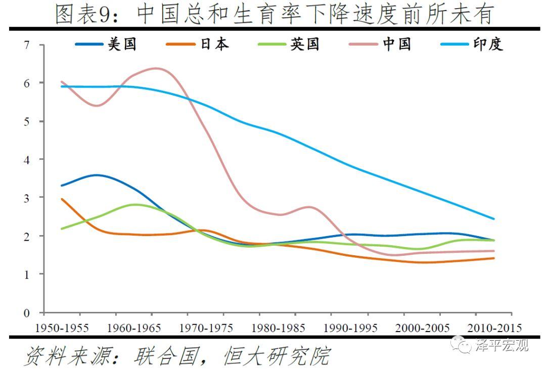 2)中国生育率下降速度前所未有,当前不仅远低于2.45的全球平均水平,还低于1.67的发达国家水平。根据联合国统计,1950-2015年美国总和生育率从3.3降至1.9,日本从3降至1.4,印度从5.9降至2.4,均远小于中国的总和生育率从6到1.6的降幅。2016年中国总和生育率为1.62,在全球位居倒数,不仅远低于2.45的全球平均水平,还低于1.67的高收入经济体水平。与墨西哥、巴西、马来西亚、俄罗斯等人均GDP相近的国家相比,中国总和生育率仍然偏低。