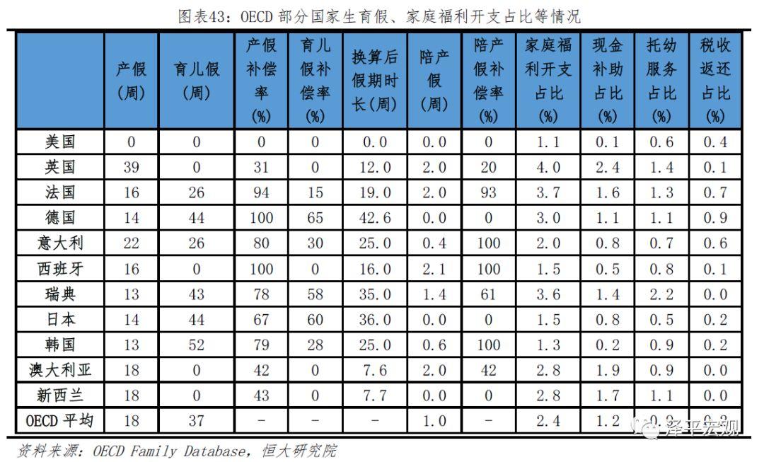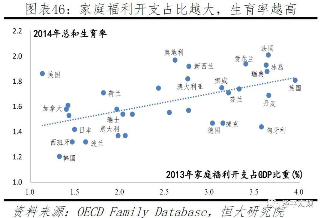 第二,发放经济补贴,2013年OECD国家家庭福利开支与GDP的比例平均约2.4%,家庭福利开支比例与生育水平存在一定相关性。2013年除土耳其外OECD32国家庭福利开支占GDP比例均在1%-4%范围,平均为2.4%,其中英国为4.0%,比重最高,土耳其为0.4%,比重最低。家庭福利开支占比越高的国家,生育水平越高。如冰岛家庭福利开支占比为3.63%,2014年总和生育率为1.93;而韩国家庭福利开支占比为1.32%,总和生育率为1.21。中国在2018年新个税改革时将3岁及以上子女的教育费用纳入税前抵扣范围,金额为固定1000元/孩/月。