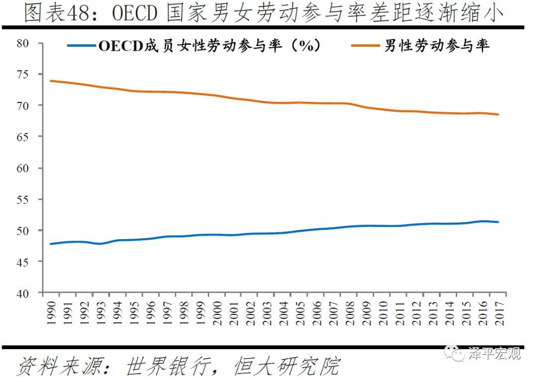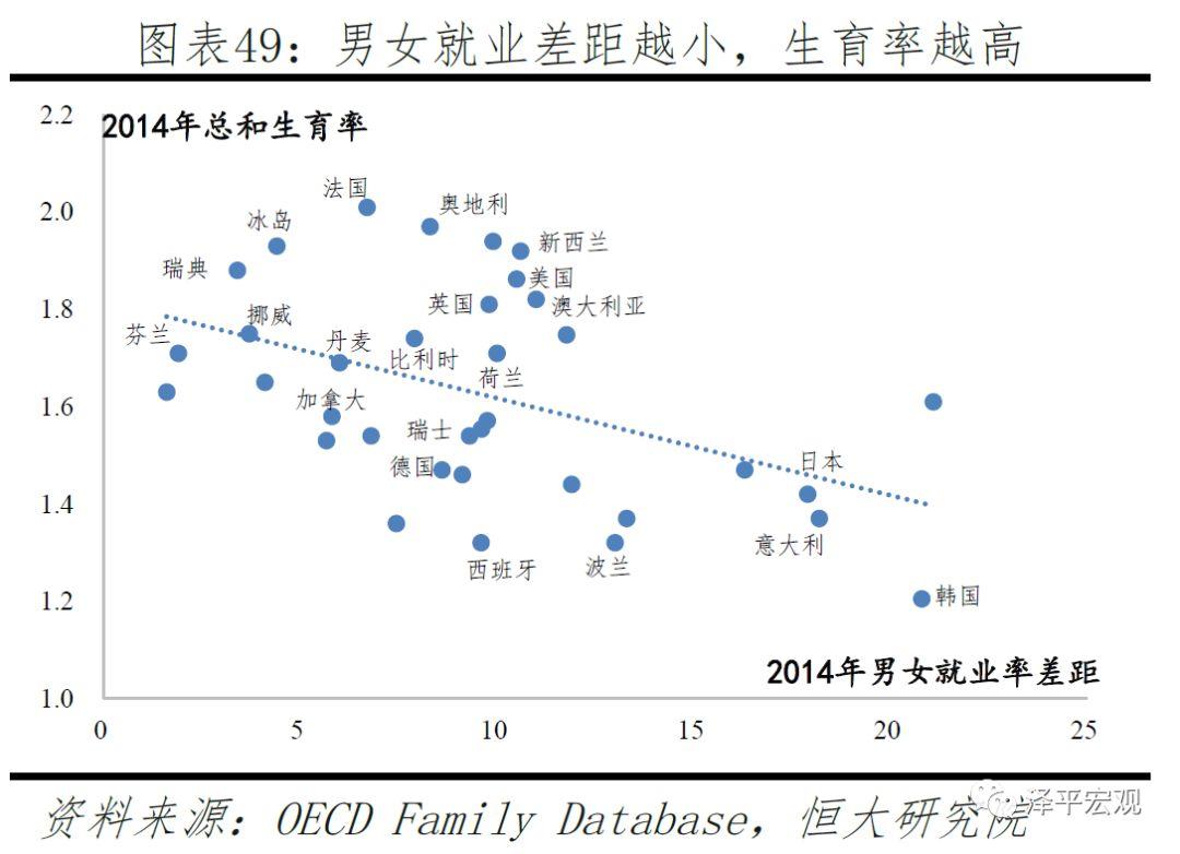三是日本“男主外、女主内”性别分工较为普遍,职场性别歧视严重越来越多日本女性放弃结婚生育,1990-2015年50岁以上女性终身未婚率从4.3%激增至14.6%。与芬兰、瑞典等国将部分育儿养老工作社会化并由国家承担不同,日本的育儿养老责任多由家庭女性承担,将女性的角色定位为全职家庭主妇的思想仍然存在,“男主外、女主内”思想较为普遍。根据世界银行,2017年日本的女性劳动参与率达50.5%,低于OECD平均的51.3%;2017年日本男女劳动参与率差距达20.1个百分点,高于OECD平均的17.2个百分点。根据OECD,2014年日本的男女就业率差距为17.9个百分点,高于OECD平均的11.8个百分点;2016年日本的全职员工中男性和女性的收入中位数差距为24.6%,高于OECD国家13.5%的平均水平。越来越多的日本女性选择(暂时)放弃家庭,进入职场。根据日本国立社会保障和人口问题研究所,1990、2010、2015年男性终身未婚率分别为5.6%、20.4%、23.4%,女性分别为4.3%、10.6%、14.6%。日本社会已形成了一种不愿结婚和生育的观念,积重难返。