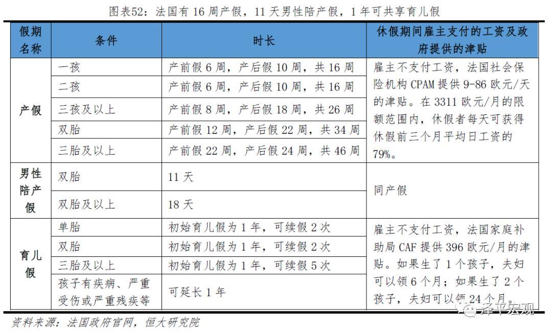 法国主要采取了以下措施:1)保障假期,设置16周产假、11天男性陪产假和1年的夫妻共享育儿假。根据法国政府官网,目前法国设置了16周产假,包括产前假6周和产后假10周。产假期间雇主不提供工资,但法国社会保险机构(CPAM)会提供9-86欧元/日的津贴。具体金额取决于休假者的工资。法国有11天的男性陪产假,期间可获得和产假一样的每日津贴。法国还设置了1年的育儿假,夫妇可共享。续假只需提前一个月向雇主申请,雇主不能反对。育儿假期间雇主不支付工资,法国家庭补助局(CAF)会提供396欧元/月的津贴。