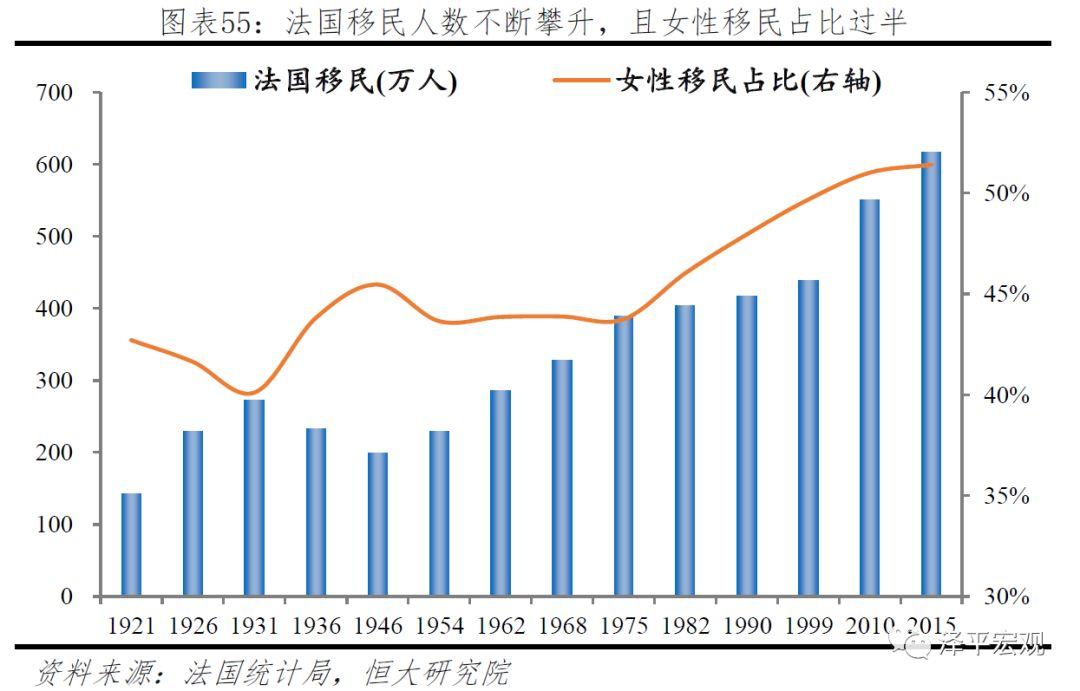 5)移民占比约9%,其中45%来自非洲,对法国生育率提升也起到一定作用。根据法国统计局,2015年法国有620万移民,占总人口的比重从1946年、1975年的5%、7.4%上升至2015年的9.3%。其中44.6%的移民来自非洲,35.4%来自欧洲。北非移民生育率较高,为法国生育率回升起到不可忽视的作用。并且,法国的移民从男性为主发展到以女性为主,1968-2015年,女性移民占比从44%上升至51%。