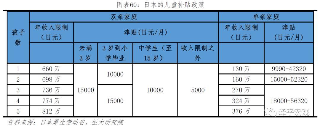 在经济补贴方面,日本生育女性可获得42万日元的一次性生育临时金、以及每月约1万日元的儿童补贴(12岁以下)。日本女性生产可以获得42万日元的一次性生育临时金,养育儿童可获得根儿童补贴。在收入限制内、抚养一个三岁以下的孩子的家庭,每个月可以获得15000日元的儿童补贴;抚养3岁到小学毕业的孩子的家庭,有2个孩子以内的每月可获得10000日元,3个孩子及以上的每月可获得15000日元等。