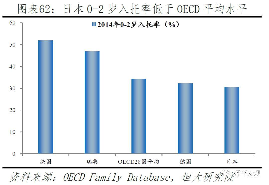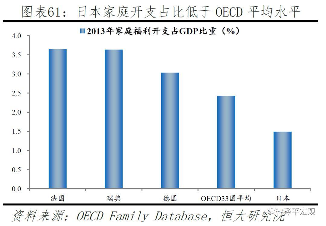 二是日本鼓励生育力度较弱,家庭福利开支占比仅1.5%,在OECD国家中排名倒数。根据日本国立社会保障和人口问题研究所,1980-2014年日本用于家庭的支出占GDP比重仅从0.47%上升至1.34%。根据OECD数据,2013年日本家庭福利开支仅占GDP的1.49%,低于OECD平均水平的2.43%,在OECD国家中排名倒数。在托幼方面,根据OECD数据,2013年日本0-2岁入托率仅为30.6%,低于OECD28国平均水平34.4%,且远低于法国的51.9%和瑞典的46.9%。