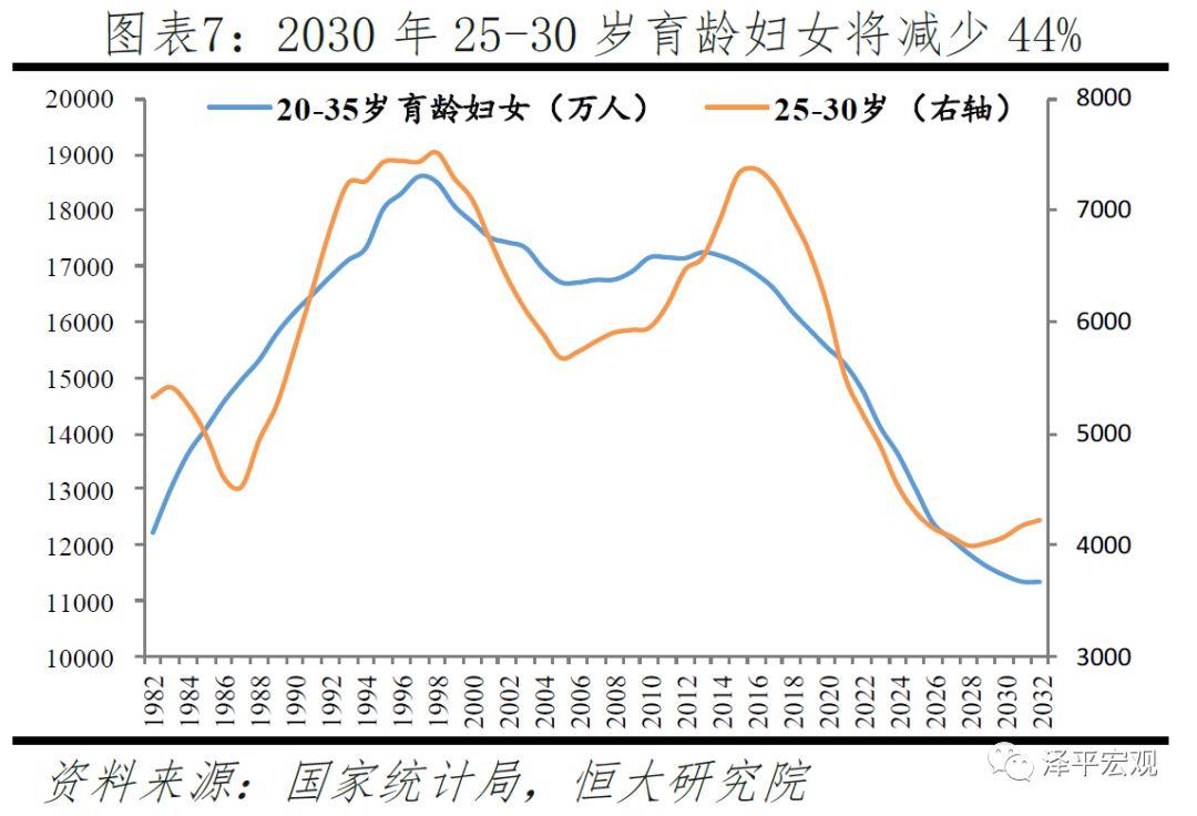 育龄妇女规模已见顶下滑,2030年20-35岁主力育龄妇女规模将比2018年减少29%,其中20-35岁生育高峰期妇女将减少41%,后续出生人口恐将大幅下滑,预计2030年将降至1100多万、较2018年减少26%。在修正人口普查数据中的低龄人口漏登后,我们估计了1982-2030年育龄妇女情况。1982年中国15-49岁育龄妇女规模为2.5亿,到2011年达3.8亿人的峰值,2018年降至3.5亿,预计到2030年将降至3.0亿。其中,20-35岁的主力育龄妇女从1982年约1.2亿增至1997年1.9亿的峰值,到2018年降至近1.6亿,预计到2030年将降至1.1亿;25-30岁生育高峰期妇女2018年约7000万,预计到2030年将降至约4100万,降幅约41%。在此背景下,预计2030年出生人口将降至1100多万。
