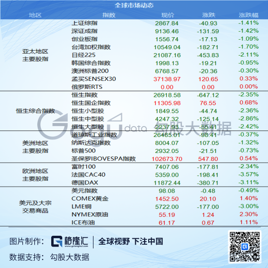 【港股】上周五港A两地股市齐挫,港股市场全日呈下跌行情,主要股指皆放量大跌超2%,恒指失守27000点。行业板块近乎全部下跌,惟黄金贵金属强势,蓝筹权重股集体重挫,尾盘地产股略有回升。截至收盘,恒指跌2.35%,报26916.58点。国指跌2.57%,报10348.63点。主板全日成交1142.62亿港元,港股通净流入38.44亿港元。