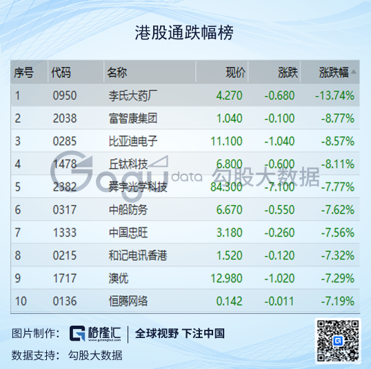 从板块表现看,避险情绪升温黄金股逆势领涨,奢侈品、房产信托等极少数板块上涨,华为、苹果概念大跌超7%领跌,濠赌股、半导体、中资券商股、汽车股、手游股、石油股皆重挫。个股方面,恒指成份股中惟领展房产基金等3股上涨;舜宇大跌近8%;腾讯大跌近4%;万洲国际、吉利汽车、瑞声、银河娱乐、港交所、三桶油等蓝筹纷纷大跌;中信证券跌6%领跌国指;招金矿业涨2.21%;港股通标的股绿城中国逆势升超5%;南方能源反驳沽空机构报告指控,午后复牌最终暴跌89%。