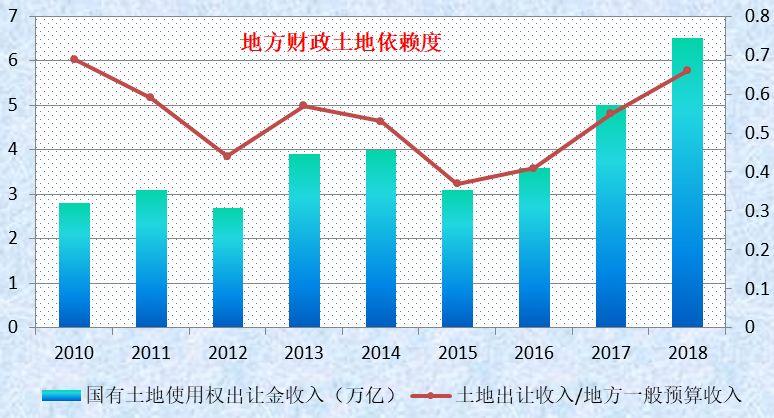 2018年,全国地方本级一般公共预算收入为97905亿元,而政府性基金预算收入中,国有土地使用权出让金收入为65096亿元。国有土地使用权出让金收入/地方本级一般公共预算收入=0.66,这一比例接近2010年0.68的水平,可见当前地方政府对“土地财政”的依赖度比较高。地方政府税收主导的一般公共预算收入自2010年以来增速不断降低,目前已降至10%以下,走势平稳。