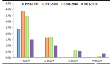 根据恒大研究院的研究,一线、二线城市人口持续流入,人口年均增速均显著高于全国平均水平,表明人口长期净流入、人口向一线二线城市聚集。三线城市流入流出基本平衡,四线城市持续流出,三四线城市合计人口年均增速显著低于全国人口平均增速。