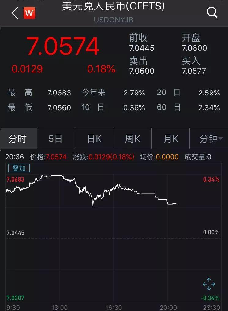 在岸人民币兑美元16:30收盘报7.0634,较上一交易日跌189个基点。人民币兑美元中间价调贬89个基点,报7.0454。