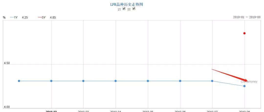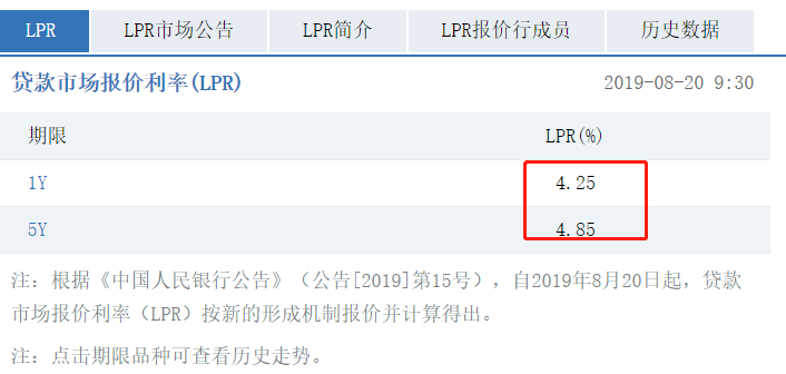 8月20日,中国人民银行授权全国银行间同业拆借中心公布,2019年8月20日贷款市场报价利率(LPR)为:1年期LPR为4.25%(此前为4.31%),5年期以上LPR为4.85%。以上LPR在下一次发布LPR之前有效。