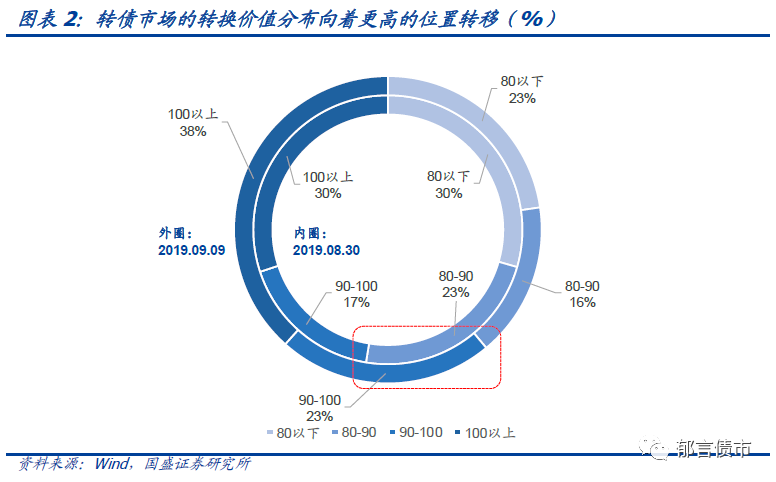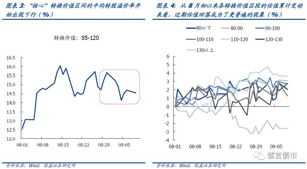 然而进入9月后,转债市场中“核心”转换价值区间的平均转股溢价率开始出现下行。权益市场反弹对于转债的最直接影响,便是使得转债市场的转换价值分布向着更高的位置转移,这也通常是转债市场估值被动压缩的主要原因。截至9月9日,转换价值在90元以上的标的数目由8月末的82个上升至105个,在存量债中占比超过60%。若市场的估值压缩仅由转换价格分布上移所致,那么“核心”转换价值区间的估值往往并不会出现明显变化,例如图3所示的8月中旬阶段。而自9月以来,“核心”区间品种的平均转股溢价率出现了明显下行,指向近期的估值压缩真正触及到了市场更为关注的主流价格区段。