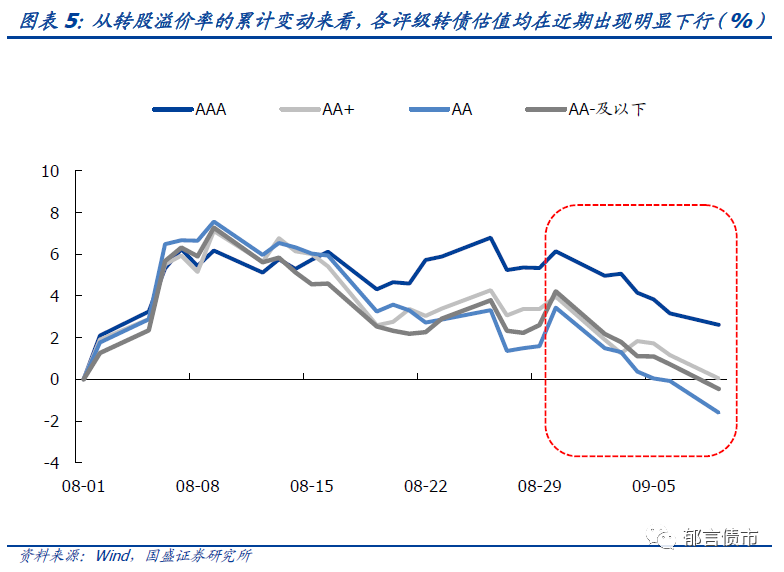 事实上,在本轮权益反弹初期(8月初),我们并不认为转债市场的估值压缩会带来更好的投资机会,因为当时的估值压缩更多是局部现象,而市场给予各个价格区段、尤其是转换价值在85-120元“核心”区间的估值水平则并未出现明显下行,甚至AAA级和AA+级转债估值还出现过逆势上涨,大量优质品种仍处在高溢价状态。而真正对估值压缩贡献较大的则大多是极端价格品种(例如转换价值在130元以上),而这对投资选择的意义并不大。