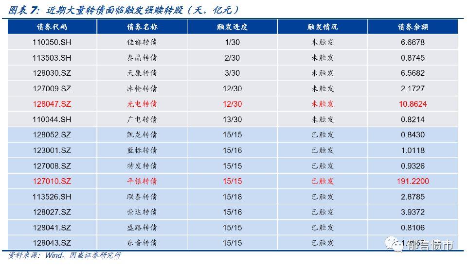 近另一方面,近期大量转债面临触发强赎转股,释放的资金能在一定程度上对其他优质品种的估值形成支撑。截至9月9日,平银转债尚有近200亿余额还未转股,在近期缺乏优质新券供给的情况下,平银转债在9月19日摘牌后释放出的资金流向选择面并不算多,其中有大量比例仍有望回流到转债市场的优质存量品种中,对其估值形成支撑。另外,我们前期重点推荐的光电转债等诸多优质品种也已进入“读秒”阶段,转股后也将部分资金,对这一效应形成助推。