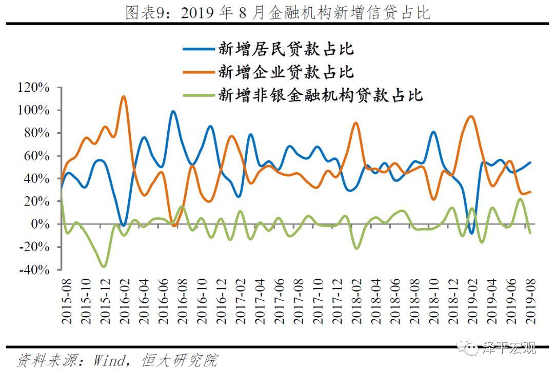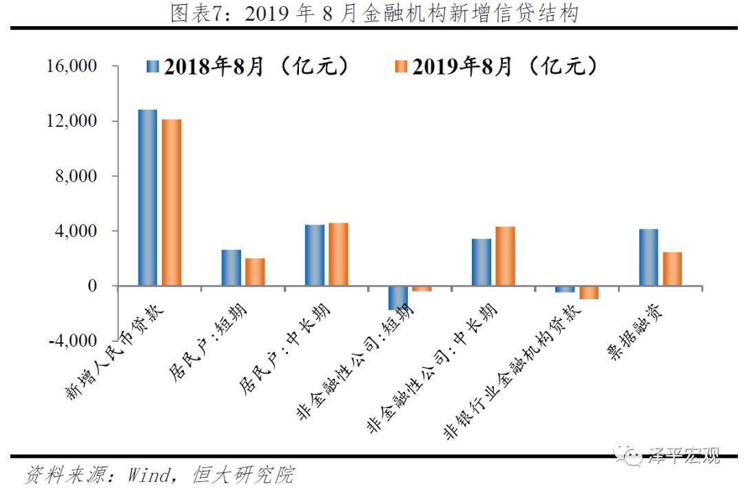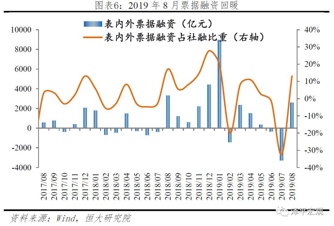从结构来看,企业中长期贷款有所回暖,居民短期贷款、票据融资是主要拖累。企业中长期贷款的改善可能源于LPR改制,银行担忧贷款利率下行因而加速企业信贷投放,或透支下一阶段企业信贷。8月新增企业中长期贷款4540亿元,同比增加860亿元,占比35.4%,较7月提升了0.7百分点。新增居民贷款6538亿元,占比54%,较7月提升5.8个百分点。其中,消费贷用途严监管,居民短期贷款1998亿元,少增600亿元;中长期贷款维持高位4540亿元,同比多增125亿元,支撑房地产销售。票据融资2426亿元,同比少增1673亿元。近期票据直贴利率下降到近三年低点,但新增融资回落反映商业活动强度仍然不高。