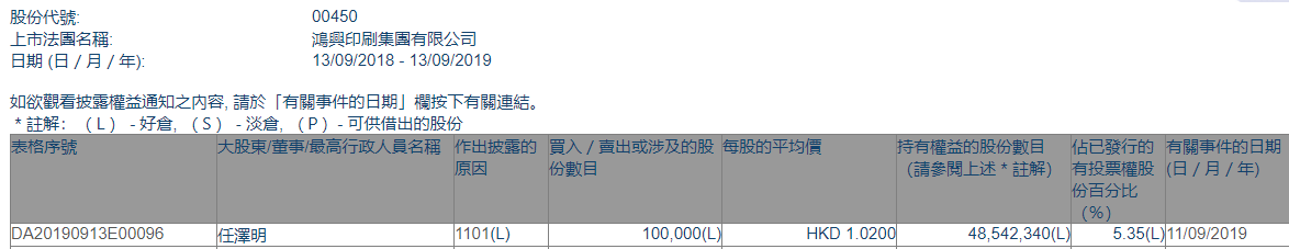 鸿兴印刷集团(00450.HK)获主席任泽明增持10万股